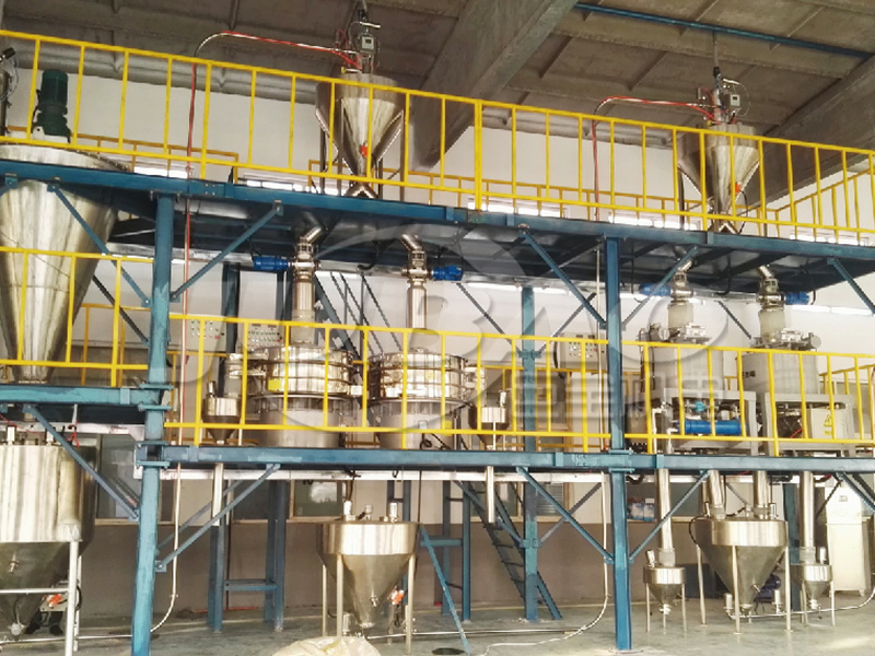 工藝流程:自動(dòng)投料、人工投料——稱重定量設(shè)備——輸送——混料機(jī)/混料機(jī)/混煉機(jī)等等