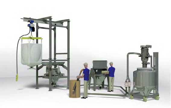 前面的噸袋拆包采用噸袋投料站,夾袋裝置夾緊袋口起到密封的作用,然后松開袋口卸料到料倉