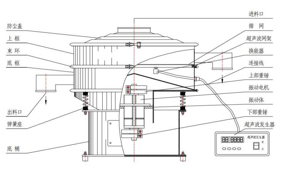 增加一套超聲波系統(tǒng)使其在篩網(wǎng)面上疊加一個高頻率低振幅的超聲振動波,促使超、微細粉體接受巨大的超聲加速度從而使篩面上的物料始終保持一種松散的狀態(tài)。