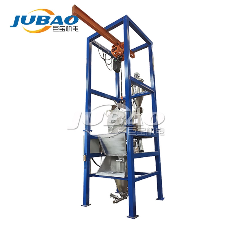 噸袋拆包機(jī)是將噸袋裝物料經(jīng)過電動葫蘆將噸袋吊起,對應(yīng)的固定支架以及稱重架與傳感器連接,將物料的重量信號傳遞給電器箱,由電控箱控制整臺機(jī)器的運(yùn)行。稱重架上的升降氣缸勾住包裝袋角。外部信號及傳感器的信號傳遞給電氣箱,電氣箱通過編制過的程序,控制加料電機(jī)的啟動、停止、轉(zhuǎn)速、氣缸的升降。