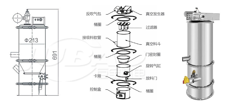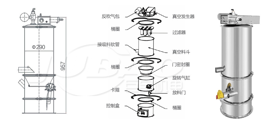 當(dāng)壓縮空氣供給真空發(fā)生器時(shí),真空發(fā)生器就產(chǎn)生負(fù)壓形成真空氣流,物料被吸入吸料咀,形成物氣流,經(jīng)過吸料管到達(dá)上料機(jī)的料倉內(nèi)。過濾器把物料與空氣徹底分離,當(dāng)物料裝滿料倉時(shí),控制器會(huì)自動(dòng)切斷氣源,真空發(fā)生器停止工作,同時(shí)料倉門自動(dòng)開啟,物料落到設(shè)備的料斗中。與此同時(shí),壓縮空氣通過脈中反吹閥自動(dòng)清洗過濾器。等到時(shí)間到或料位傳感器發(fā)出上料信號(hào)時(shí),自動(dòng)啟動(dòng)上料機(jī)。
