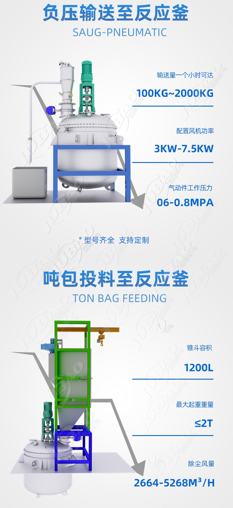 固體加料設(shè)備通常采用外接式真空源,將設(shè)備倉(cāng)內(nèi)產(chǎn)生真空,在密閉的物料管道內(nèi)形成氣流,帶動(dòng)粉粒體物料在密閉管道內(nèi)快速輸送,物料到達(dá)投料設(shè)備內(nèi)部后,在卸料到下一工段反應(yīng)釜內(nèi),卸料的同時(shí)進(jìn)行反吹,吹落氣固分離器外側(cè)附著的物料,對(duì)氣固分離器進(jìn)行清潔,保證透氣性。物料卸完后,又進(jìn)行吸料卸料,依次循環(huán)進(jìn)行。